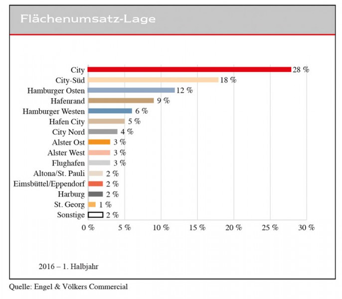 Der Büromarkt in Hamburg zeigt sich mit einem Flächenumsatz von rd. 240 000 Quadratmetern im 1. Halbjahr 2016 äußerst stabil. Gegenüber dem Ergebnis des Vorjahreszeitraums (255 000 Quadratmeter) ist das ein Rückgang um 5,9 Prozent. Insgesamt wurden lediglich vier Vertragsabschlüsse über 5000 Quadratmeter registriert. Mehr als die Hälfte (58,3 Prozent) des gesamten Flächenumsatzes wurde in den Lagen City, City-Süd und im Hamburger Osten umgesetzt. Die City-Süd konnte ihren Anteil (von 13,1 auf 18,3 Prozent) aufgrund zweier Großabschlüsse am stärksten ausbauen. Unter den Großabschlüssen befindet sich auch eine Vermietung an TUI Cruises, welche durch Engel & Völkers Commercial vermittelt wurde.